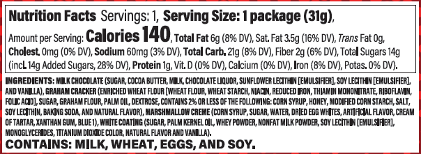 Ingredients: Milk Chocolate (sugar, unsweetened chocolate, whole milk powder, cocoa butter, soy lecithin [emulsifier], natural vanilla extract), Graham Cracker (enriched wheat flour [wheat flour, wheat starch, niacin, reduced iron, thiamin mononitrate, riboflavin, folic acid], sugar, graham flour, palm oil, dextrose, contains 2% or less of: corn syrup, honey, modified corn starch, salt, soy lecithin, baking soda, natural flavor), Marshmallow Crème (corn syrup, sugar, water, dried egg whites, artificial flavor, cream of tartar, xanthan gum, blue 1), White Coating (sugar, palm kernel oil, whey powder, nonfat milk powder, soy lecithin [emulsifier], titanium dioxide color, natural flavor, and vanilla).